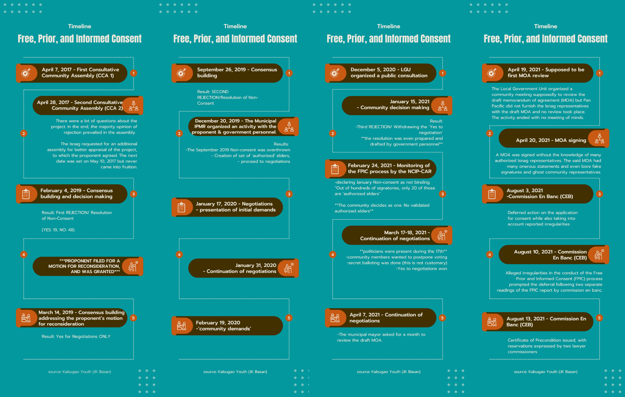 For the whole year of 2020, negotiations and consultations were held. The pandemic might have slowed down the process, but in January 2021, there was a community decision-making event where the people rejected the project for the third time. Henceforth, another series of negotiations was made. In April 2021, an agreement was signed between the company and “unauthorized” community representatives. Then in August, an FPIC process marred with alleged irregularities was conducted.